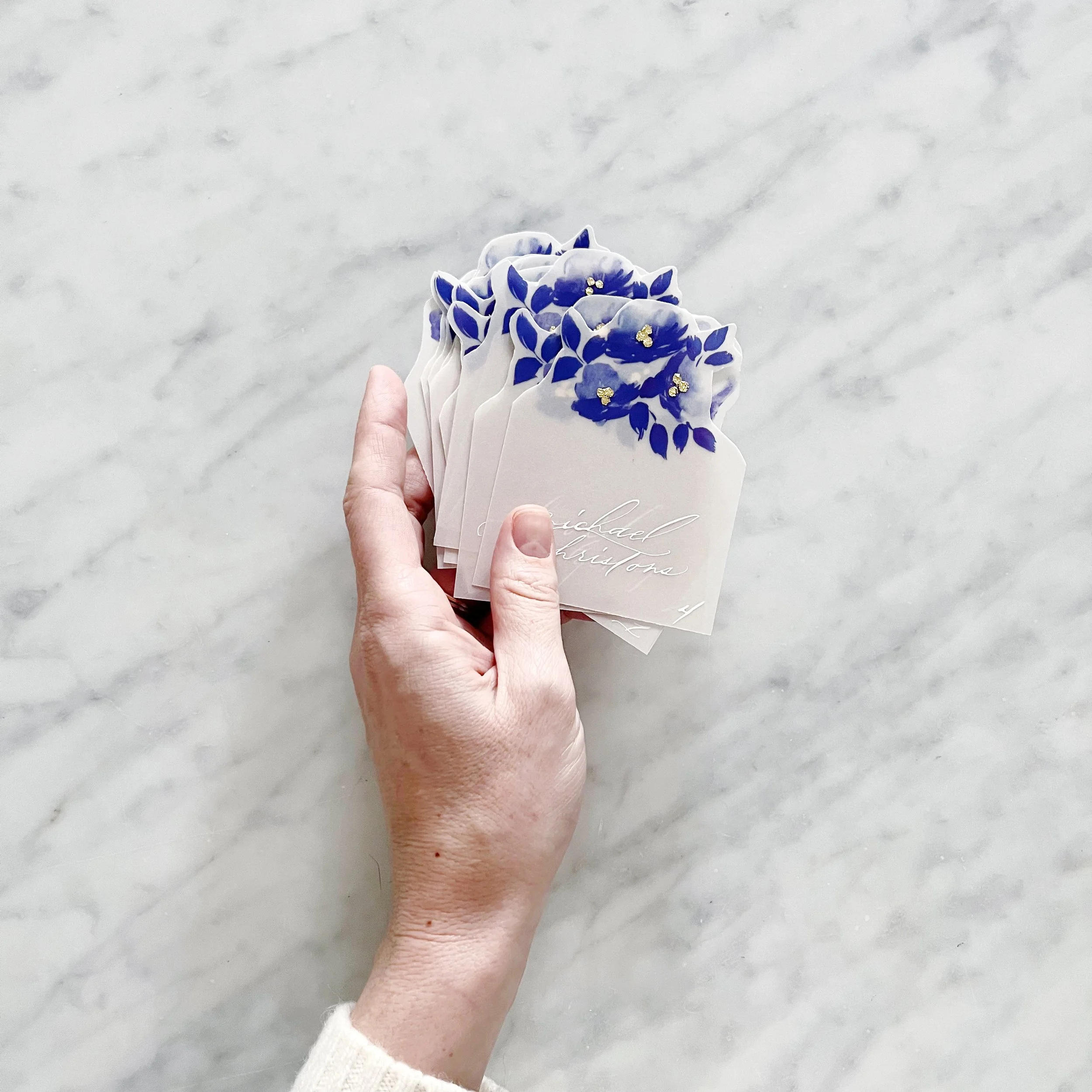 We created two different designs for the escort cards to use as meal indicators, and each card had a cluster of gold gilding at the centers of their blooms.